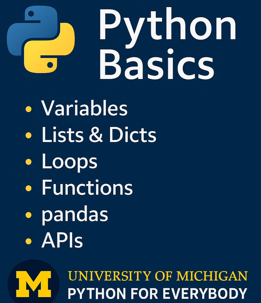 Python-in-progress professional completed the University of Michigan’s “Python for Everybody” on Coursera and with DataCamp coursework lined up to deepen practice. Currently gaining skills in using Python at a foundational level for data cleaning, simple automation, and ad-hoc analysis, and building toward stronger proficiency in pandas, APIs, and scripting to accelerate reporting and decision support.